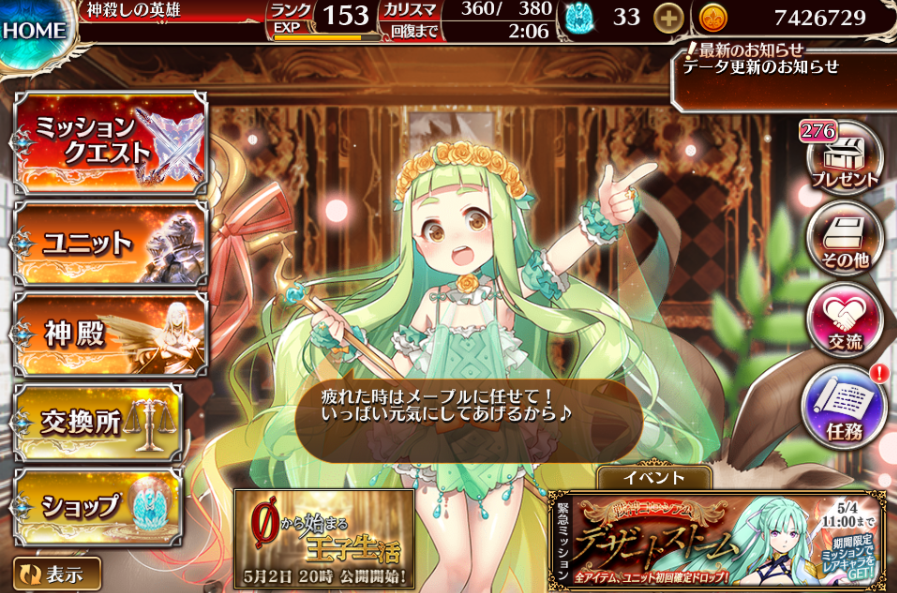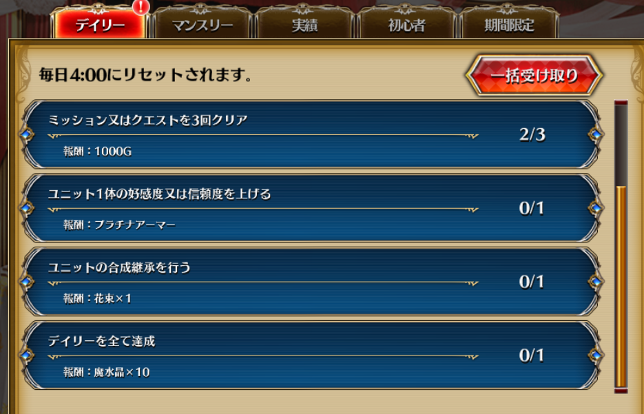 毎日のミッションをこなすと、委任チケット・プラチナアーマー・魔水晶など育成に役立つアイテムが手に入ります。