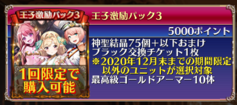 王子激励パックは3代目として更新されており、ランク黒チケより対象範囲がかなり広くなっています。序盤からというよりは、高難易度を攻略するうえで特定のキャラが欲しくなったタイミングで購入するのがベストです。