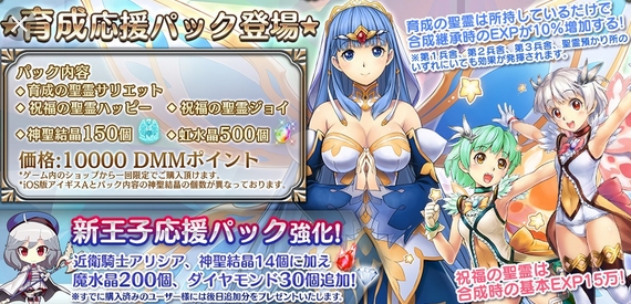 新王子応援パックはブラックユニットのアンジェラ+覚醒に必要な育成素材が1,500円で手に入るお手軽パックです。ちょっと課金できる方ならスタートダッシュとして非常におすすめ!