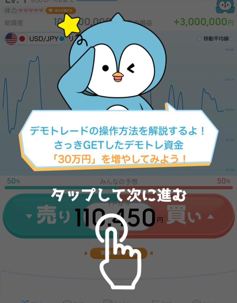 チュートリアルでは仮想資金30万円を受け取り、デモトレードを体験します。