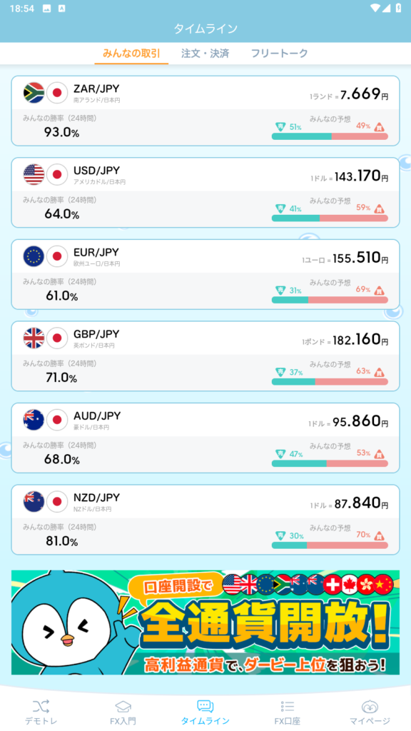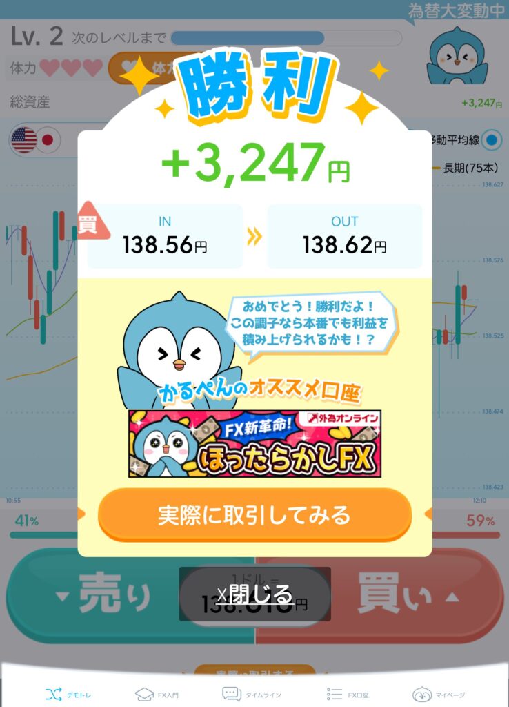 トレードを重ねるごとにプレイヤーレベルが上がり、取引できる通貨ペアも増えていくので、使い続けるほど楽しさが広がっていきますよ!