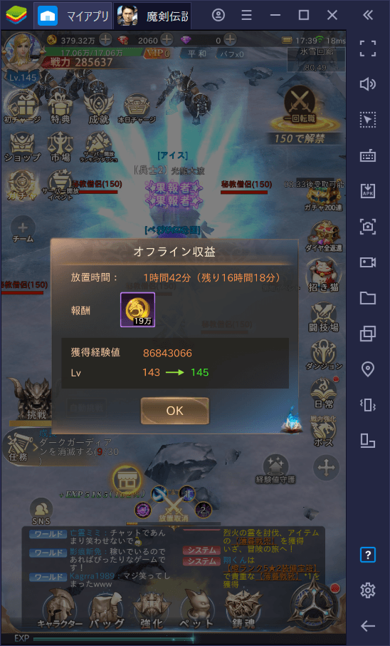 さらに、オフライン中も経験値や装備素材がもらえる「放置報酬」があるため、毎日ログインするだけで着実に強くなれる点も高評価です!