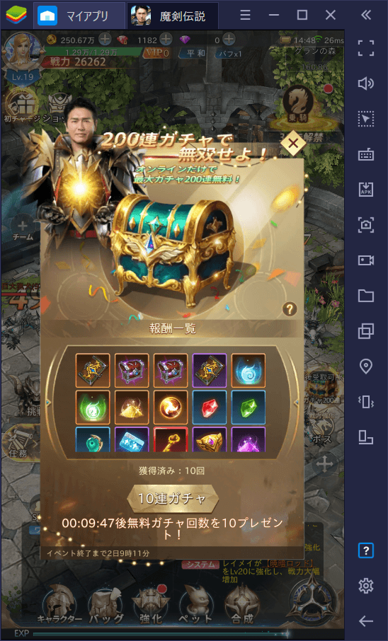 なお、ゲームを起動しているあいだにログイン時間が加算され、一定時間ごとに最大200連まで無料ガチャが引けるシステムも搭載されています。少しでも長くログインしておくとお得ですよ。