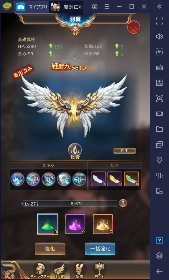特に羽根は見た目の豪華さに加えて戦闘力アップに直結する重要な要素なので、積極的に育てていきましょう。