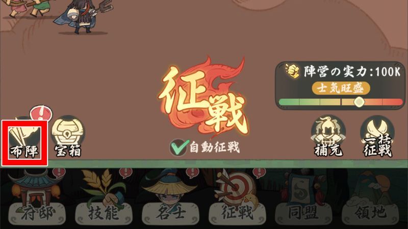 - 布陣を組む — 手持ちの名士を編成します。「まとめて出陣」ボタンで自動配置もできます。