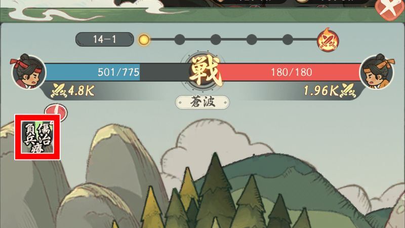 - 負傷兵を治療 — ボスに辿り着くまでに兵士が傷ついた場合は治療します。兵士に空きがあれば「補完」も忘れずに。