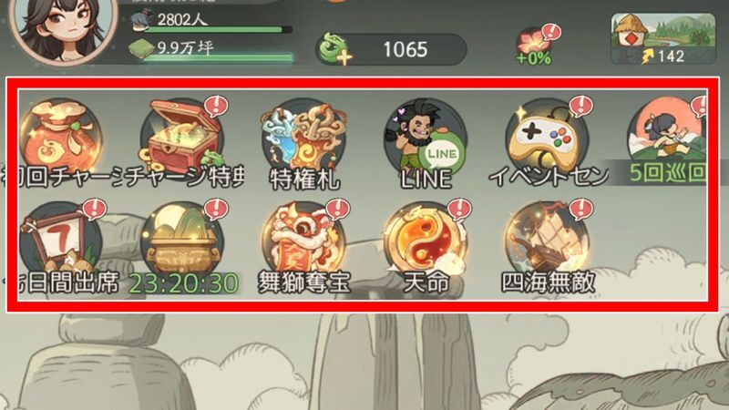 モーマンタイムでは常に何らかのイベントが開催されています。玉壁などのアイテムや知己の獲得ができるので、画面上部のアイコンは全部チェックするようにしましょう!