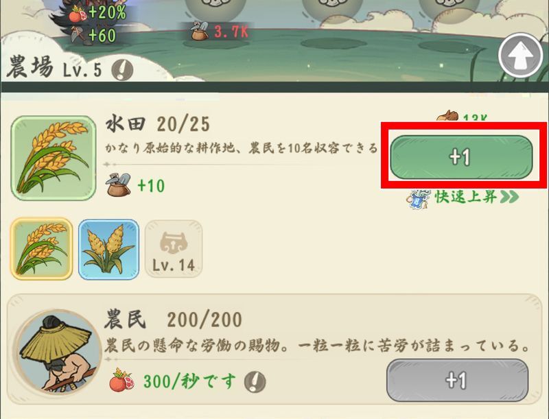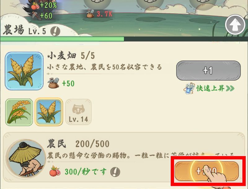 - 上段が最大になったら、下段の「+」ボタンで獲得資源を追加