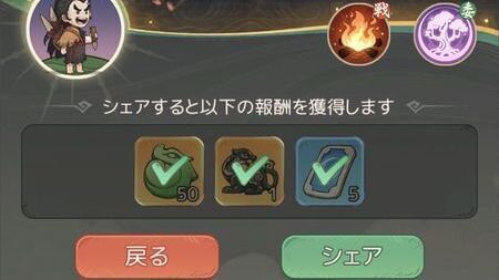 ストーリー進行時に登場するシェア画面では、「シェア」をタップすることで報酬が獲得できます。実際にシェアする必要はなく(キャンセル可能)、ボタンをタップするだけで大丈夫。毎回忘れずにタップしましょう!
