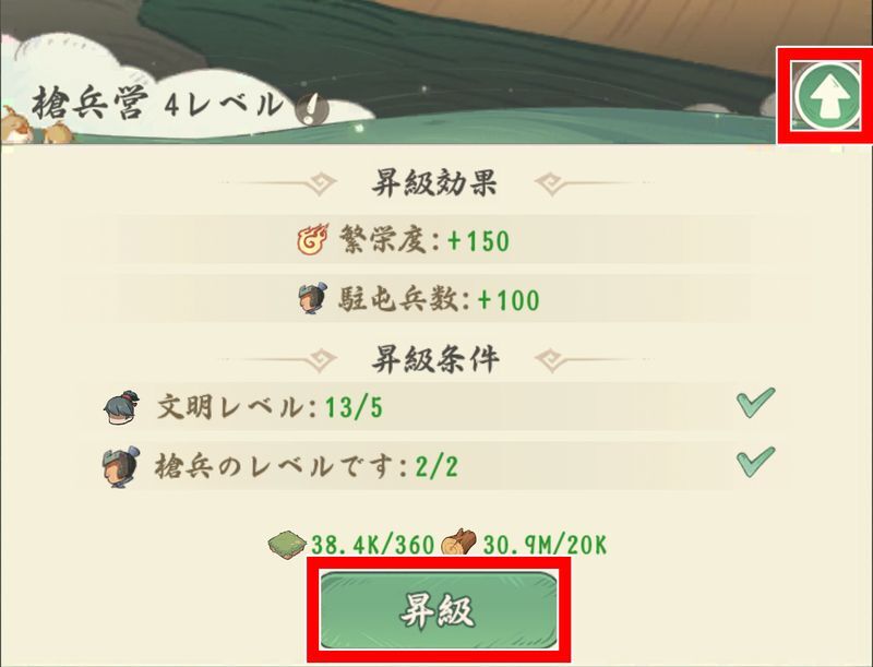 - 資源が最大まで追加されたら「↑」ボタンから「昇級」