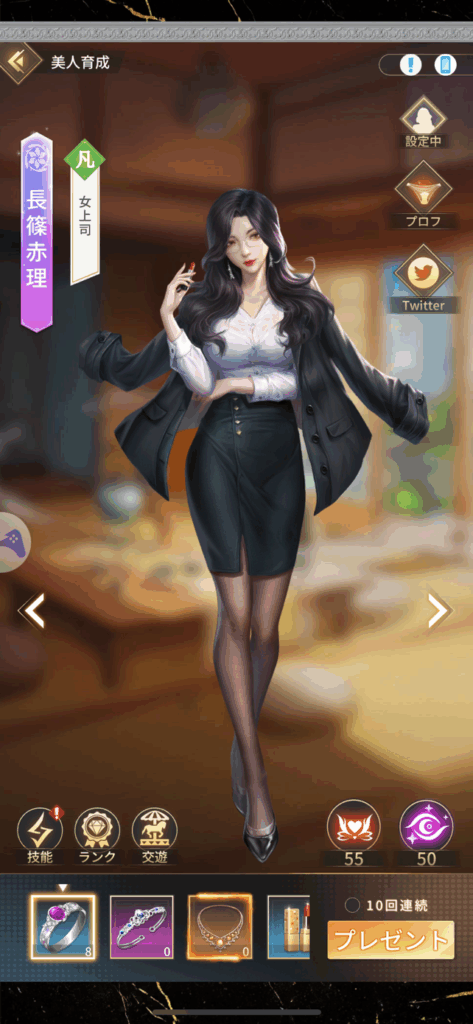 秘書たちは美しいだけじゃなく、優秀な実力者ばかり。「技能」を強化することで、プレイヤーのステータスもアップするので、恋愛も経営も両方で頼れる存在になっていきます。