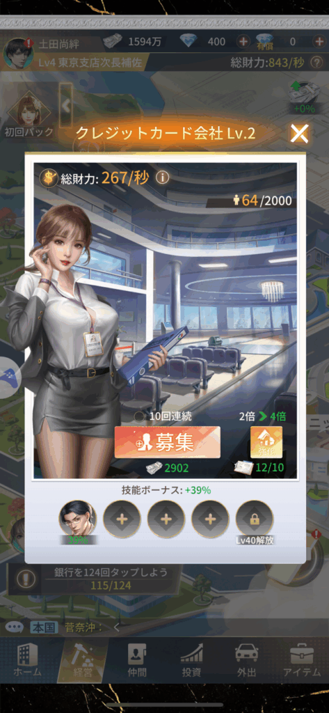 攻略の鍵は「施設のレベルアップ」や「従業員の募集」といった経営面。キャラクターの性能より、育成と配置の工夫が重要です。