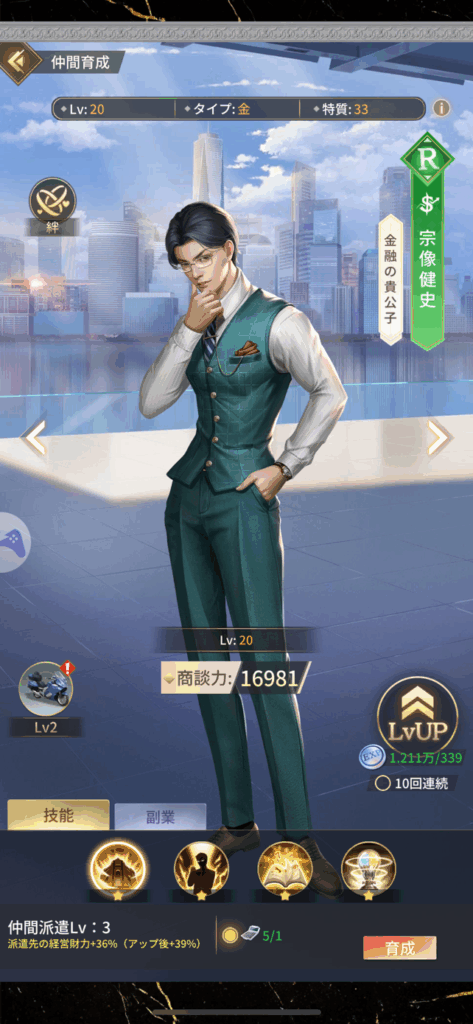 登場する部下たちはRPGのキャラクターみたいに育成できます。レベルを上げると能力値がアップして、商談バトルで有利になります。