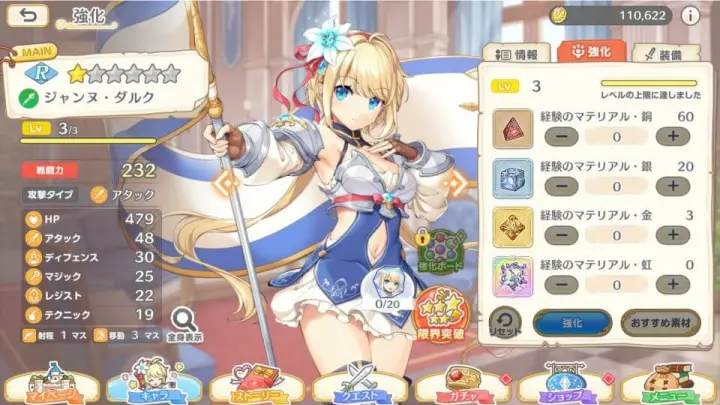 レベル上げはもちろん、スキルの強化や進化素材を集めてキャラをランクアップさせましょう。そして忘れちゃいけないのが装備!装備を強化するだけでステータスがぐんぐん伸びるので、序盤から入手できる装備もきちんと強化することが大切です。