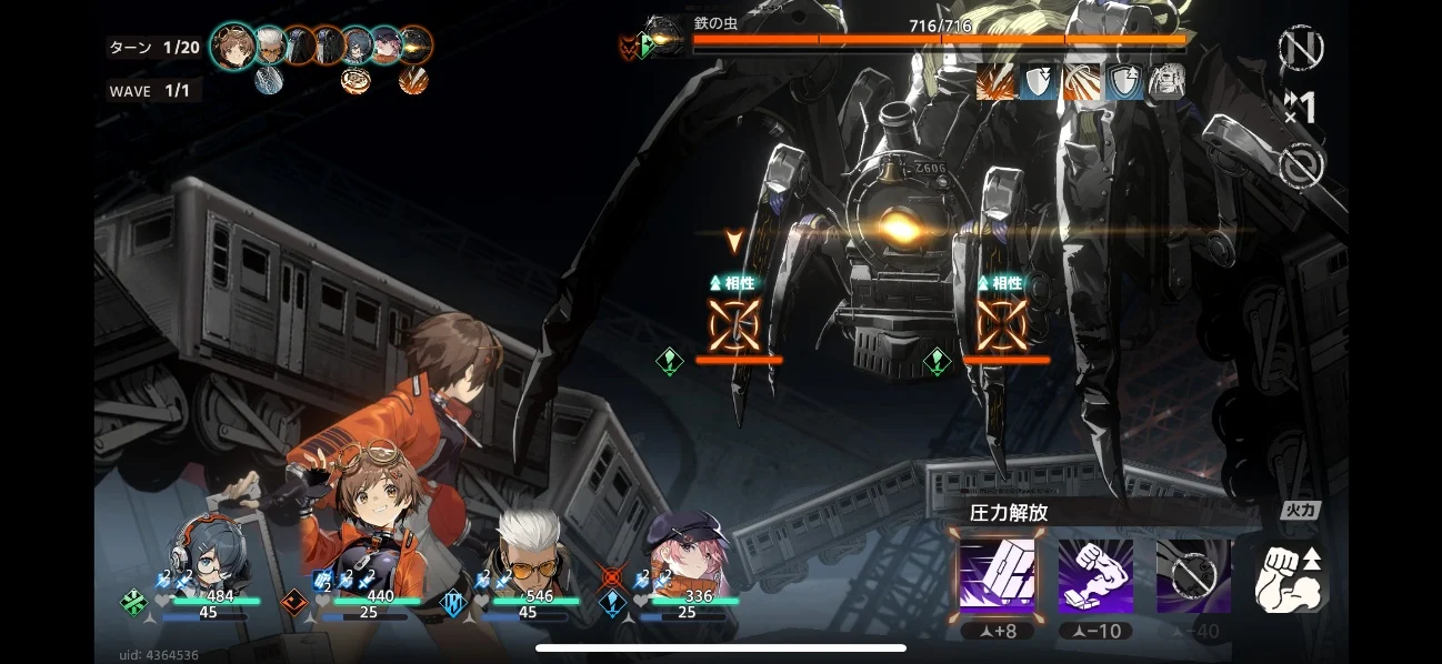 本作のバトルはターン制ですが、キャラクターを配置する「陣形」がめっちゃ重要。例えば中央のマスは敵から狙われやすい代わりに攻撃も当てやすいので、耐久力が高い援護役のキャラを置くと安定します。両端は比較的安全だから、攻撃力の高いキャラを配置するのが基本ですね。