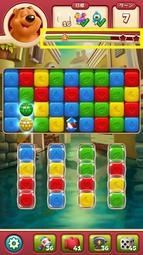 ステージ中の星の獲得状況はゲージで表示されます。一度に消すブロックを多くするほど、ゲージが早く溜まって星を獲得しやすくなります。