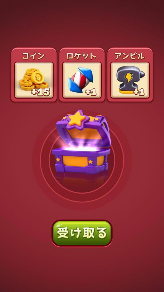 宝箱の中身はランダムで、コイン×1とアイテム×2が入っていることが多いです。