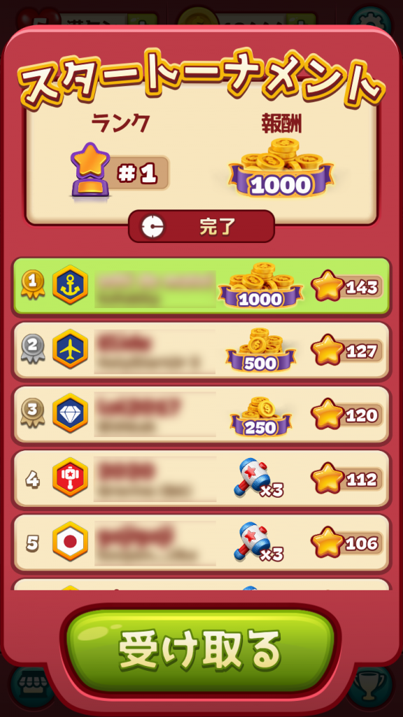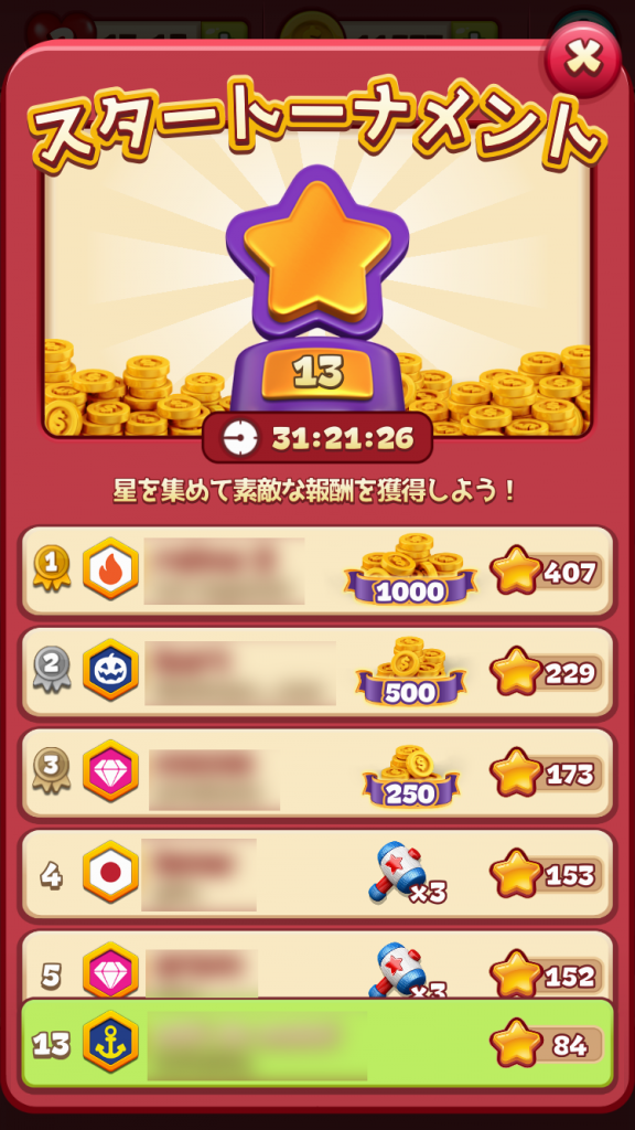 『トゥーンブラスト』には「スタートーナメント」というイベントがあり、集めた星の数で他のプレイヤーと競い合います。