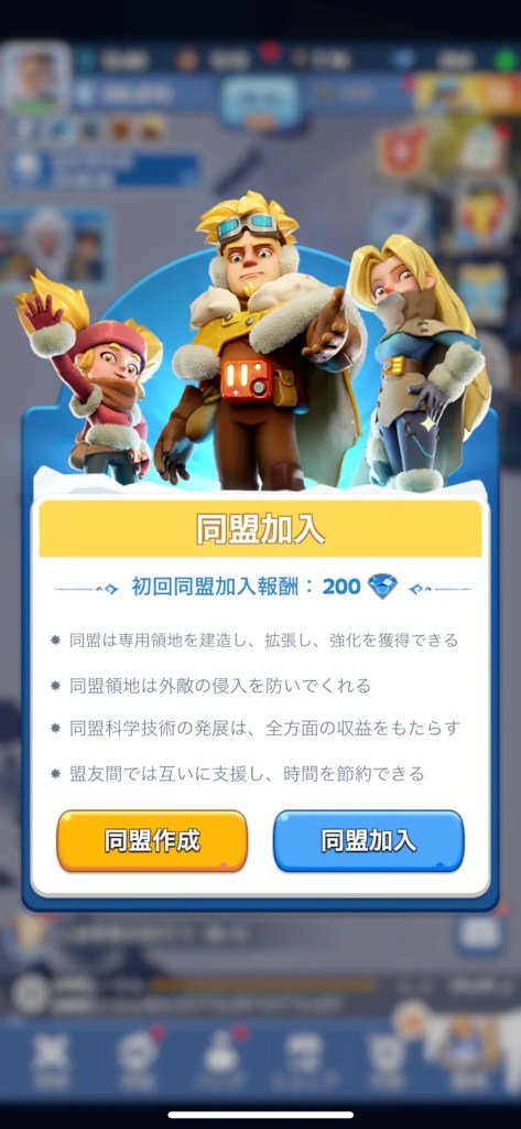 同盟に加入すると、他のプレイヤーと協力できるようになります。メンバー同士の情報交換や助け合いは、ゲーム攻略の強い味方。効率的な進行にはマストですよ!