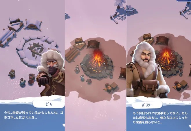 拠点を発展させる楽しさ\n資源を集めて建物を建造・強化。寒さや資源不足に対応できる拠点作りがポイントです。