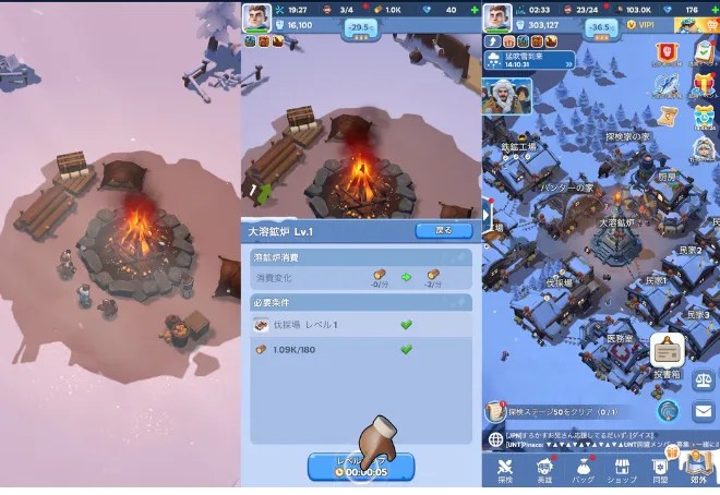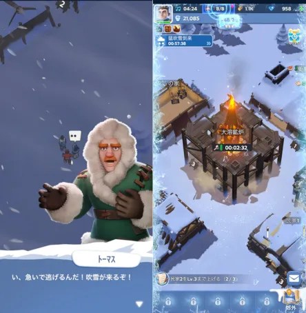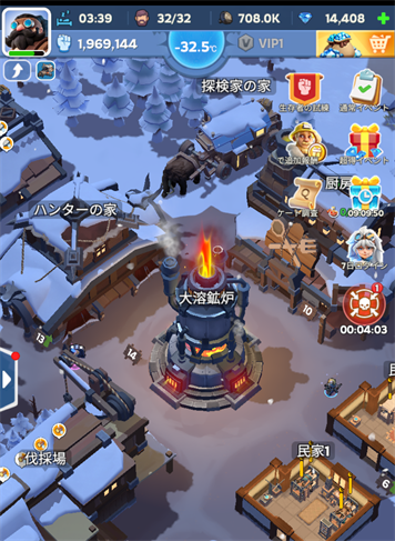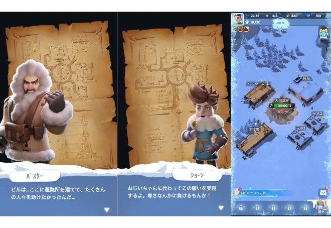 ゲームの基本は「資源集め → 施設の建設 → レベルアップ」というサイクル。プレイヤーが村長となって、極寒の地に新たな村を築いていくのが最大の目標です。