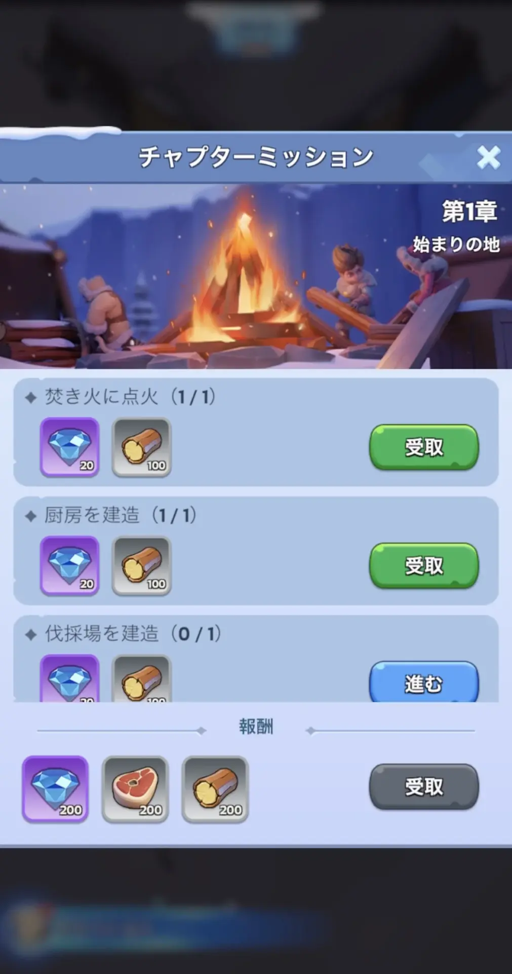 ミッションを進めるだけで、建物のレベルアップが自動で進む!序盤は焚火からスタートして、厨房・民宿・医務室・狩猟作業場などの生活施設を次々と建設。