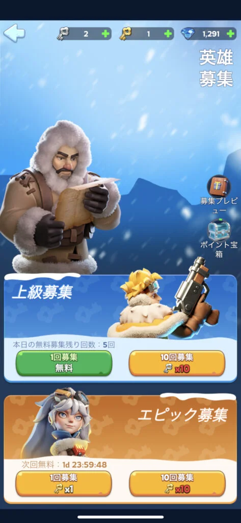 「英雄ロビー」を建設すると、英雄の募集(いわゆるガチャ)ができるようになります。初回の募集では、SR英雄の「セルゲイ」が確定で手に入るし、リセマラの必要性は低い。実は2日目のログイン報酬でSSR英雄の「ジャスミン」も無料でもらえちゃいます!