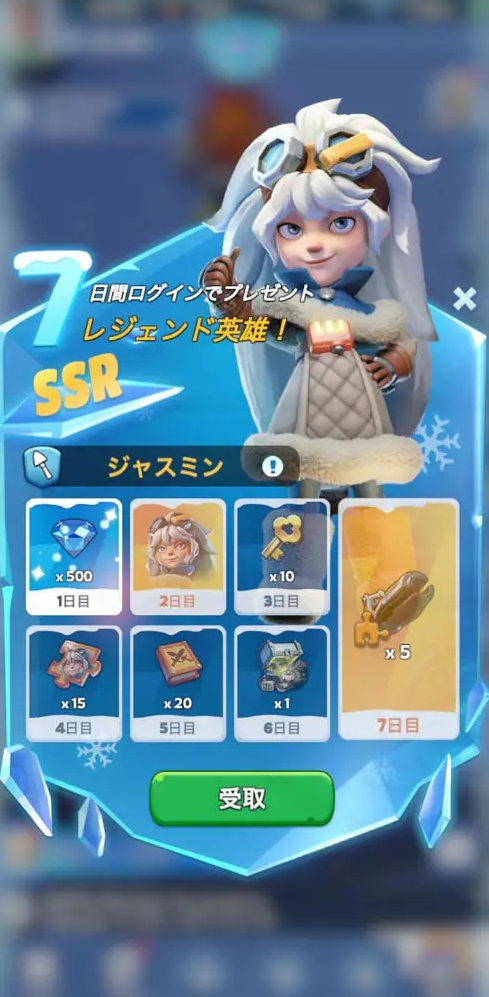 ゲーム開始から7日間、毎日ログインすると豪華な報酬がもらえます。特に2日目にはSSR英雄の「ジャスミン」、7日目には「雪精霊パーツ×5」が!これらは序盤の戦力強化に役立つから、毎日ログインをお忘れなく。