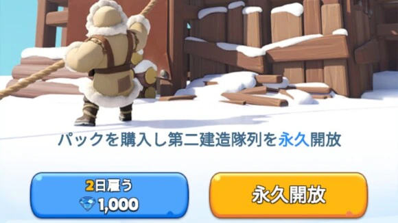 都市開発をもっと効率よく進めたいなら、第二建造隊列の解放がおすすめ。同時に2つの建造・強化ができるようになります。ダイヤの消費か課金が必要ですが、長期的な発展を考えるとかなりお得です!