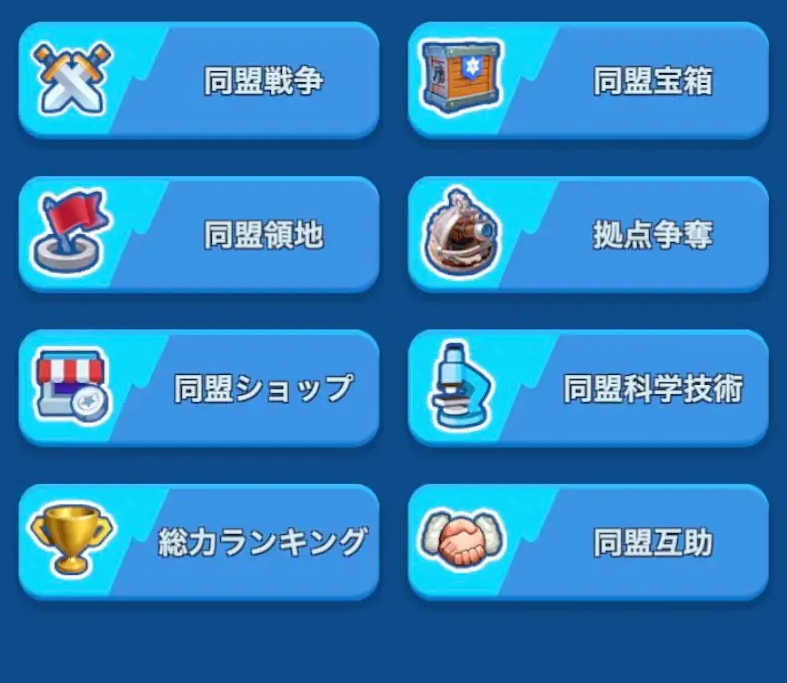 ギルドバフや限定イベント\n同盟に加入すると、バフ効果や限定イベントに参加可能に。強くなるには同盟加入が必須ですよ!